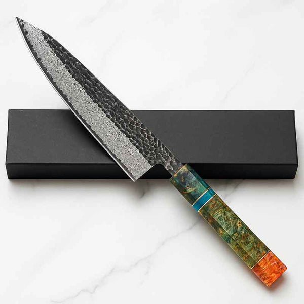 Afinal de contas, uma paixão como a sua merece uma ferramenta à altura. Olhe para a lâmina: o padrão único e hipnotizante é a prova de um trabalho artesanal, o que elimina a sua frustração com facas de Damasco falsas e sem alma. Em outras palavras, ter uma faca damasco assim é uma declaração de estilo e bom gosto. Além disso, a embalagem premium eleva a experiência, transformando a compra em um verdadeiro ritual de "unboxing" digno de um colecionador.