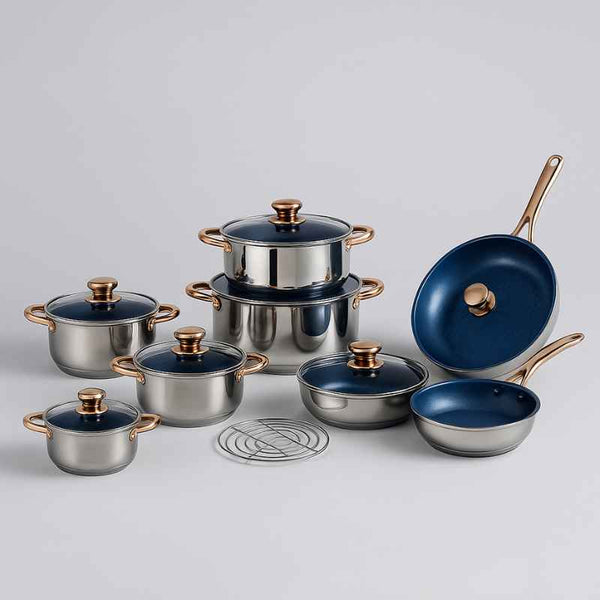 Para quem busca praticidade sem abrir mão do sofisticado, este conjunto premium de panela de aço inox é a solução definitiva. Desenvolvido em aço cirúrgico com revestimento antiaderente azul e cabos Rose Gold, ele une durabilidade profissional, design elegante e luxuoso e desempenho impecável – transformando cada refeição em uma experiência gourmet, seja no dia a dia ou em jantares especiais. É o toque de mestre usado pelos melhores chefes de cozinha do mundo!