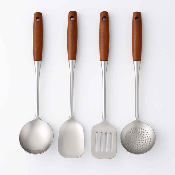 Composição: Inclui Espátula Vazada, Espátula Sólida, Concha e Escumadeira. Peças fundamentais para cada preparo;